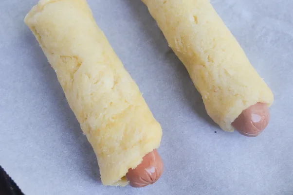 - Use a knife to cut the dough into four even pieces. Pat the hot dogs with a paper towel to remove surface moisture and gently wrap a piece of dough around each, leaving he ends exposed, pinching at the seam to close. The dough will expand a bit during baking, so try to wrap each as closely as possible without breaking the dough.